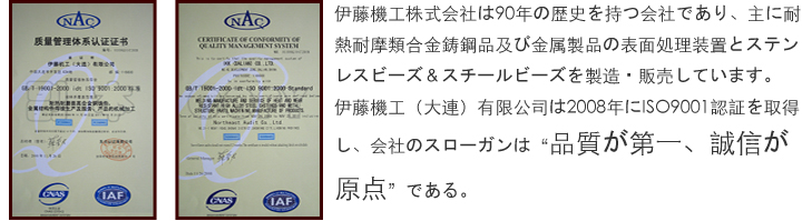 伊藤機工(大連)有限公司(IKK(DALIAN)CO.,LTD.英文略字IKKD)は日本伊藤機工株式会社の100%出資により2003年10月に設立されました。敷地面積は12,000 u、工場総建築面積は7,200uです。鋳造、機械加工、製缶3つの製造工場を持ち、主に、耐熱耐摩高合金鋼鋳物;金属製品製缶及び機械加工;各種ブラストマシン及び線材棒材用ディスケーリングマシンの製造&販売を行っている。