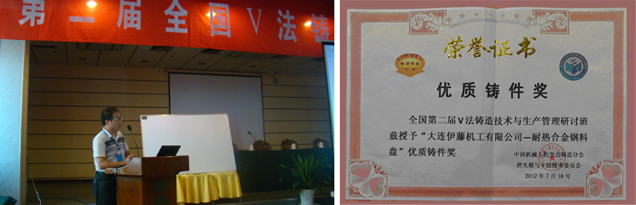 2012年7月18日,“全国第二届V法铸造技术与生产管理研讨会”成功召开,我公司的“耐热合金钢料盘”被评为“优质铸件奖”。